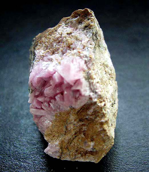 Foto 2 zeigt rosafarbige keilförmige Inesit-Kristalle bis 6 mm Durchmesser auf Bementit-Matrix