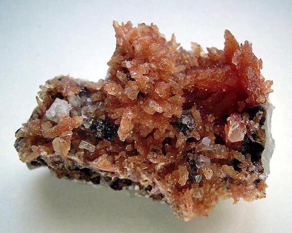 Foto 3 zeigt orangerote Garben aus radialstrahligem Inesit mit farblosen-weißen Kristallen