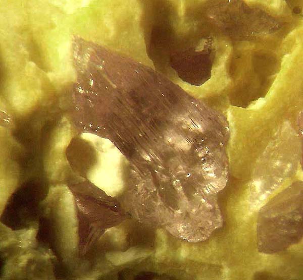 Fotos zeigen rosafarbenen rhomboedrisch und spitz zulaufenden Diaspor-Kristall von 3 mm Größe in gelber "Dillnit"-Matrix (fluorreicher Zunyit); daneben auch tafelige u. flächenreiche Diaspor-Kristalle;