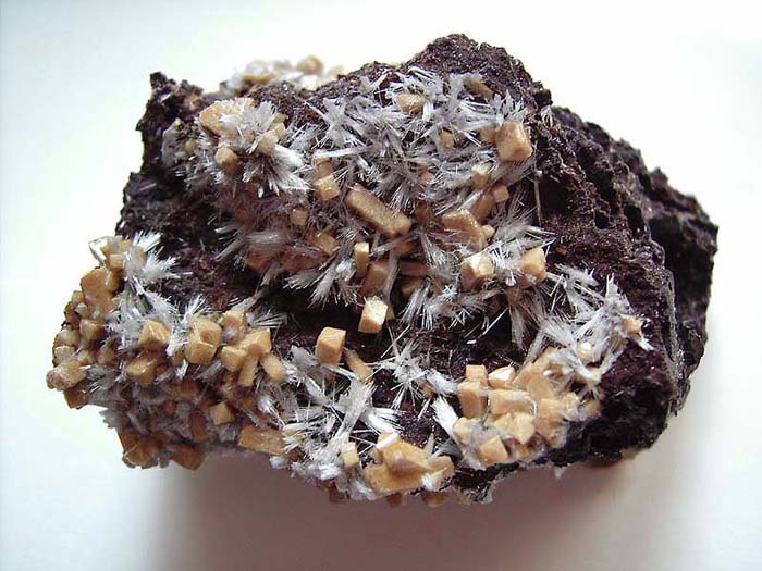 | Information: | Größere Kleinstufe mit weißen-farblosen strahligen Büscheln (- 5 mm) von Bultfonteinit in Kontrast mit fleischfarbenen 5 mm langen Kuben von Poldervaartit |