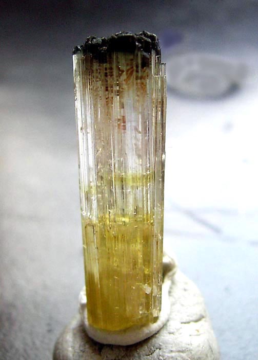 | Information: | Einzel-Kristall v. 2,2 cm Länge. Rossmannit farblos, Elbait gelb, Foitit schwarz |