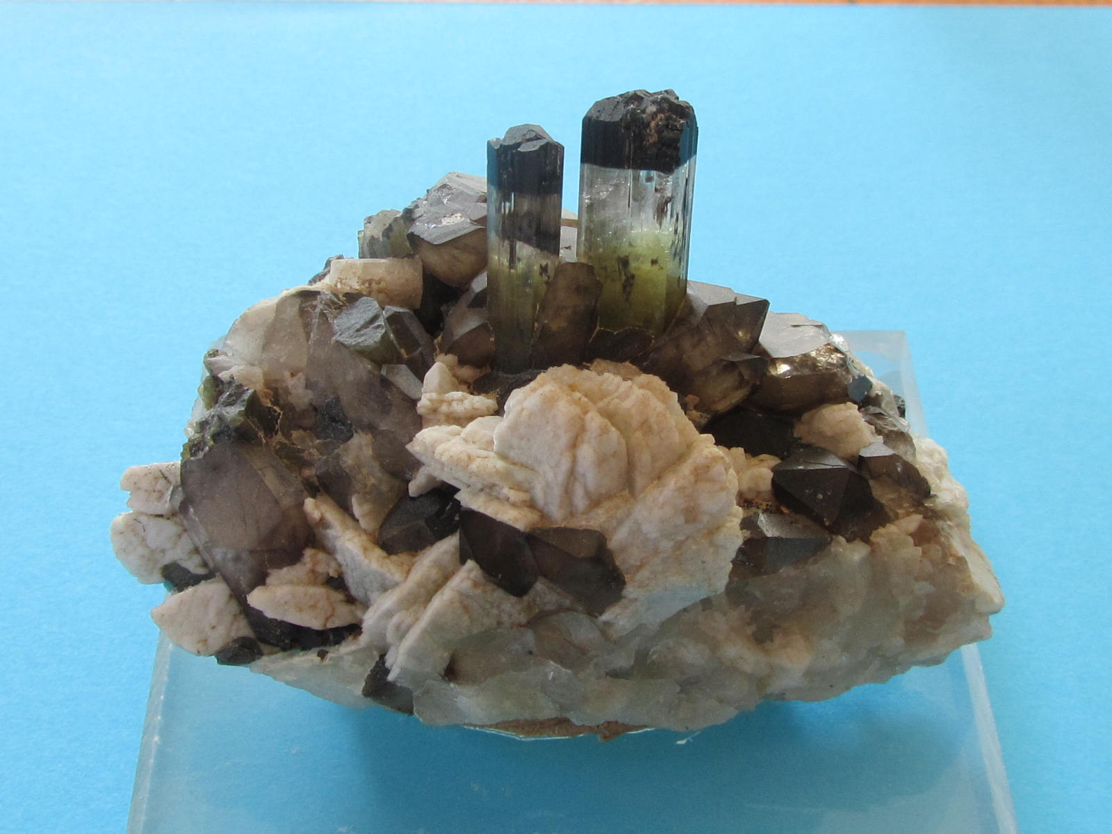 In den tertiären Graniten selbst fanden sich vielfach Miarolen-Räume mit Orthoklas (xx), Albit (xx), Rauchquarz, Beryll, mehrfarbigem Turmalin, Lepidolith, Pollucit, Petalit (Kastor), Chabasit, Stilbit sowie D’Achiardit (besonders von San Piero).