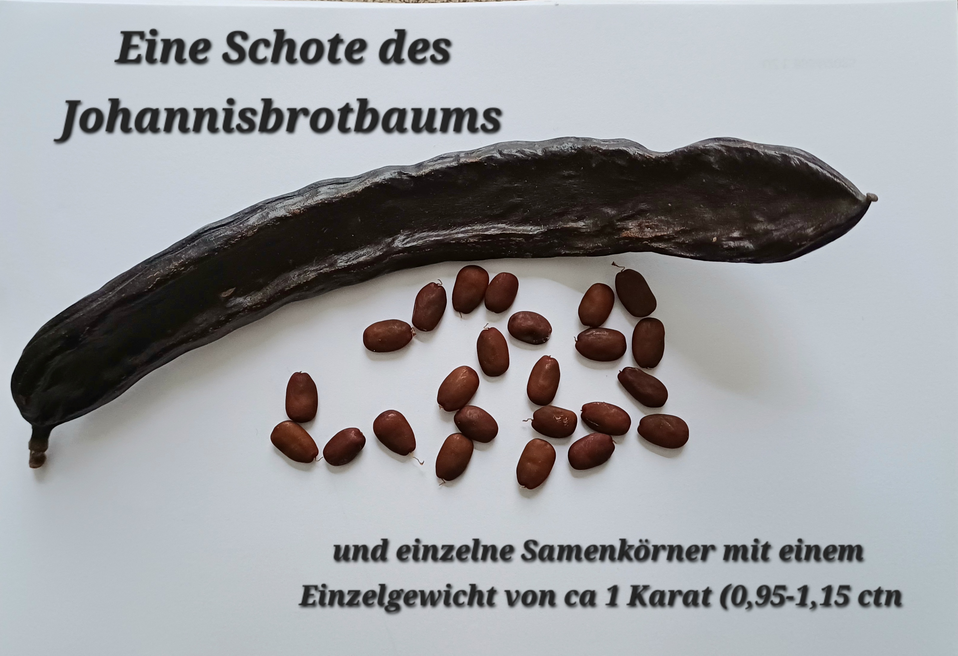 Der Johannisbrotbaum ist der Ursprung der Gewichtseinheit Karat (ct), die sich vom griechischen Wort für seine hörnchenförmigen Früchte („kerátion“) ableitet.